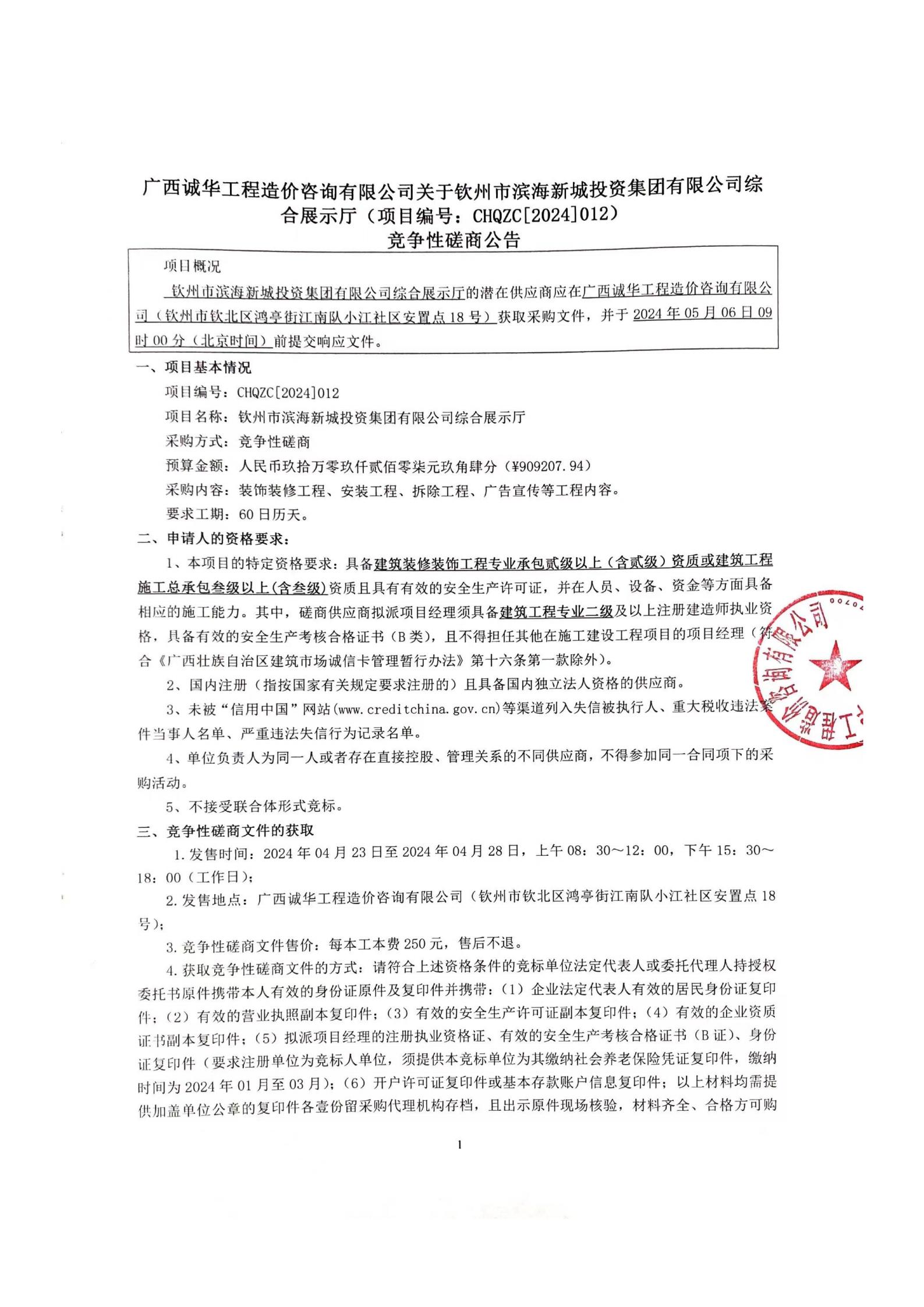 欽州市濱海新城投資集團(tuán)有限公司綜合展示廳競(jìng)爭(zhēng)性磋商公告