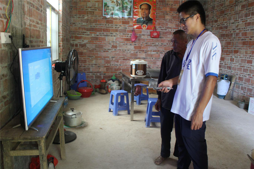 圖為工作人員為貧困戶安裝電視機