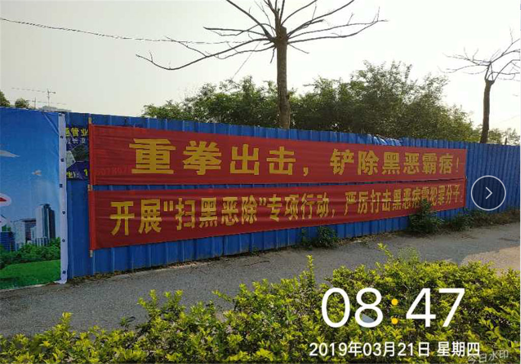 為抓好此項(xiàng)工作,通知各項(xiàng)目代表深入現(xiàn)場(chǎng),并召集施工單位召開(kāi)了專(zhuān)題動(dòng)員會(huì),并制定了具體的工作措施,如:張掛橫幅、微信群、qq群等渠道宣傳掃黑除惡行動(dòng)。做到每個(gè)項(xiàng)目現(xiàn)場(chǎng)都在明顯位置張掛掃黑除惡標(biāo)語(yǔ)的橫幅。
