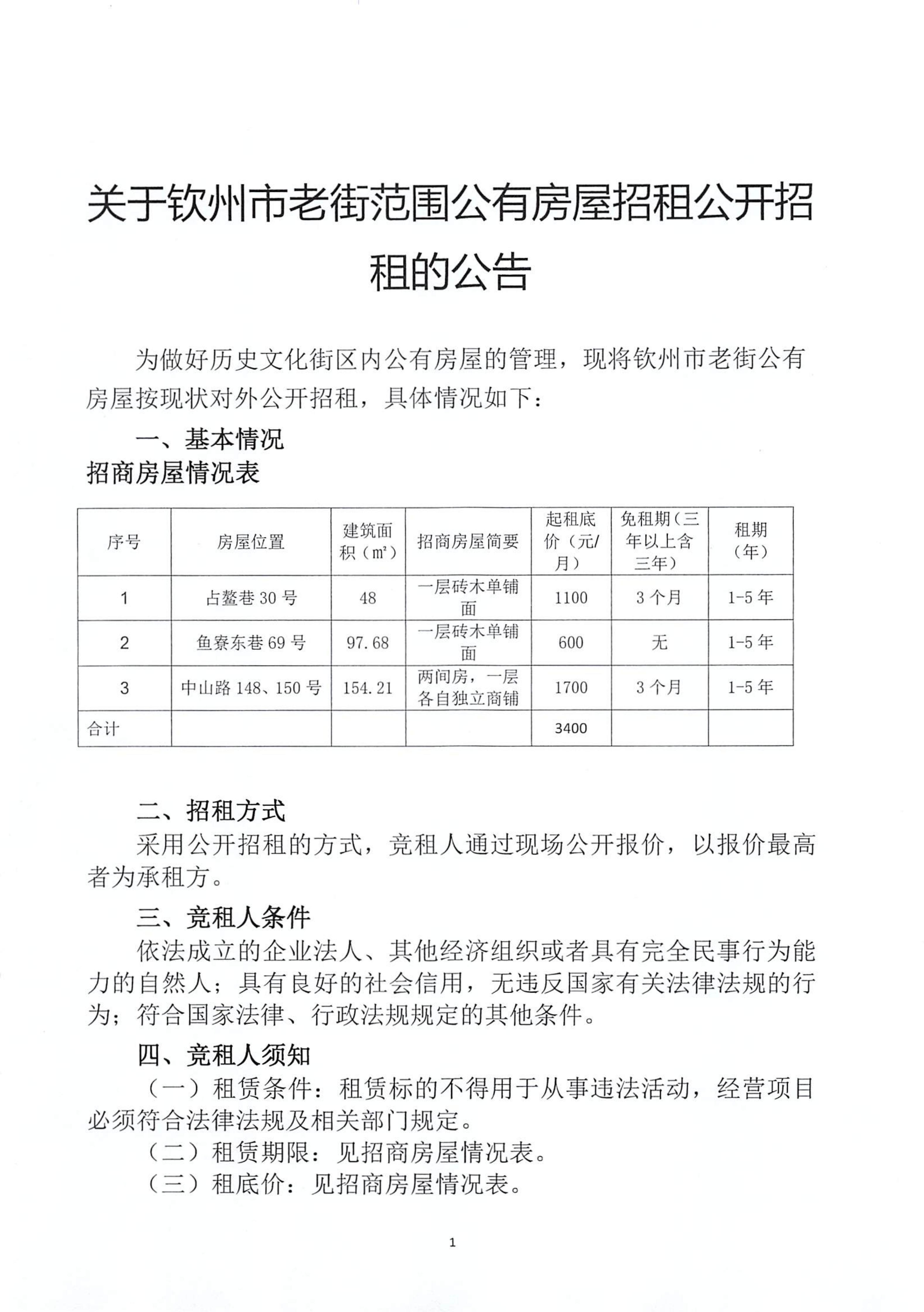欽州市老街范圍共有房屋招租公開(kāi)招租公告