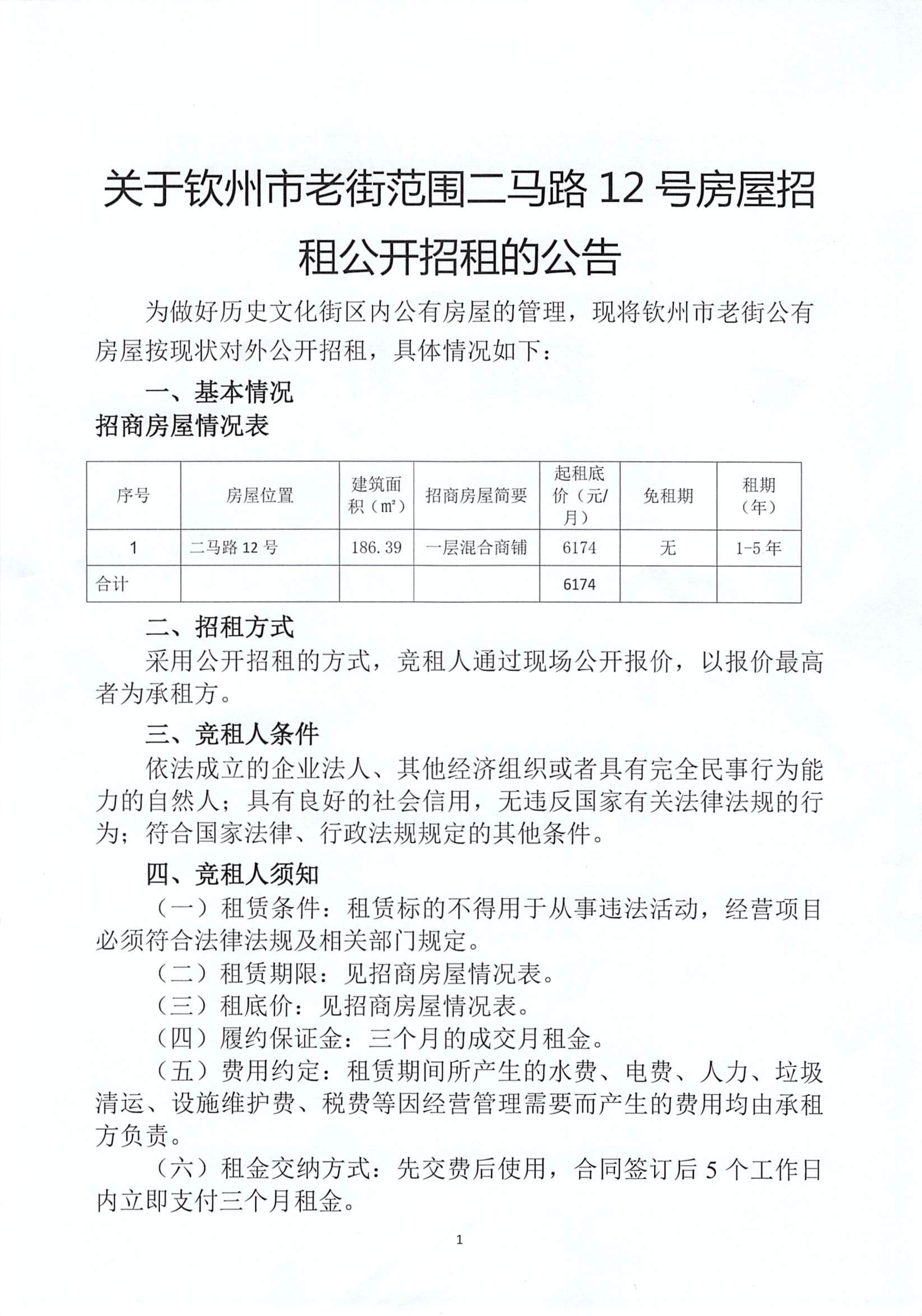 關(guān)于欽州市老街范圍二馬路12號房屋招 租公開招租的公告